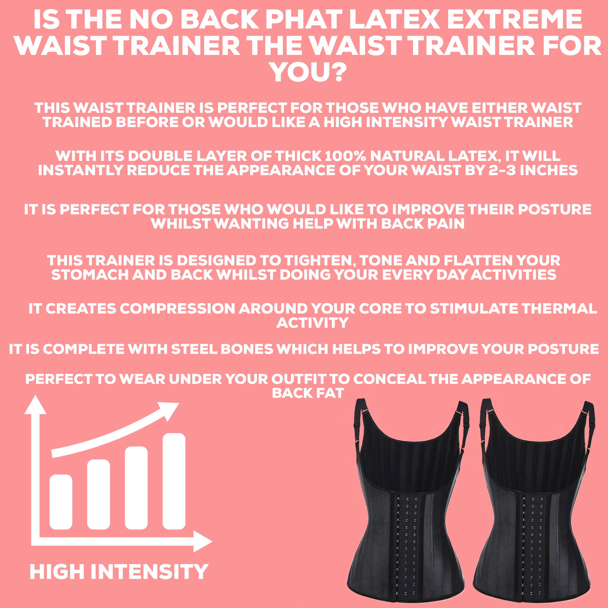 Our new No Back Phat Latex Waist Trainer is designed to tighten, tone, and flatten both your stomach and back during workouts or everyday activities. Made from 100% latex, it provides firm posture support while delivering high intensity compression. This trainer creates targeted thermal activity in your core, helping you achieve instant visible results and long-term shaping with consistent wear.